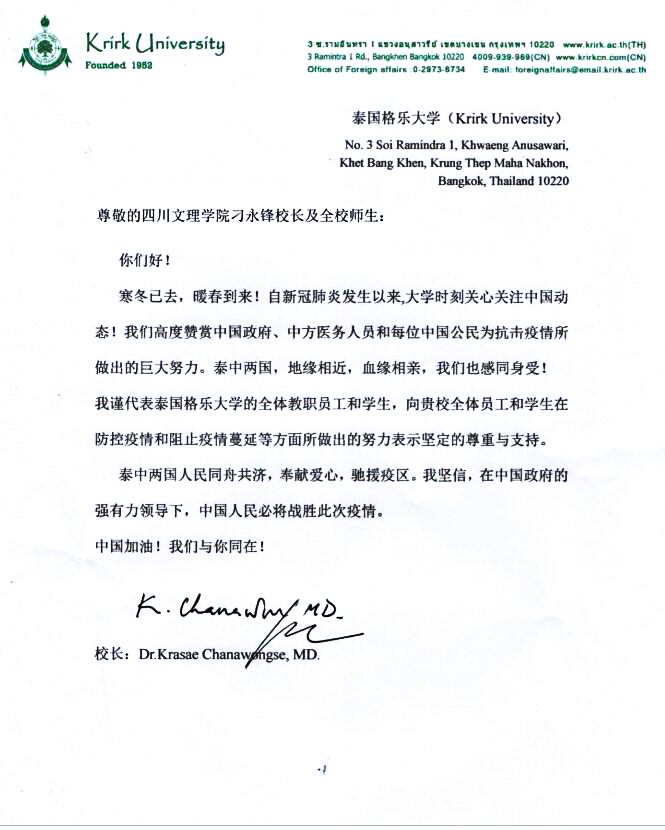 “中国加油!我们与你同在”。今日,学校收到泰国格乐大学校长Dr. Krasae Chanawongse,MD来信,他向我校全体师生在防控疫情和阻止疫情蔓延等方面所做出的努力表示坚定的尊重与支持,对中国政府、中方医务人员和每位中国公民为抗击疫情所做出的巨大努力表示高度赞赏,并坚信在中国政府的强有力领导下,中国人民必将战胜此次疫情。 此前,格乐大学曾于2019年来校交流访问,双方商议拟在教师访学、学生交流交换等方面开展合作。