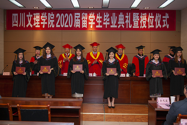 党委宣传部、教务处、学生处、国际交流合作处、保卫处等职能部门负责人、文学与传播学院、财经管理学院、智能制造学院党总支书记、院长、留学生班主任、教师代表,2020届毕业留学生和在校留学生代表参加了典礼。