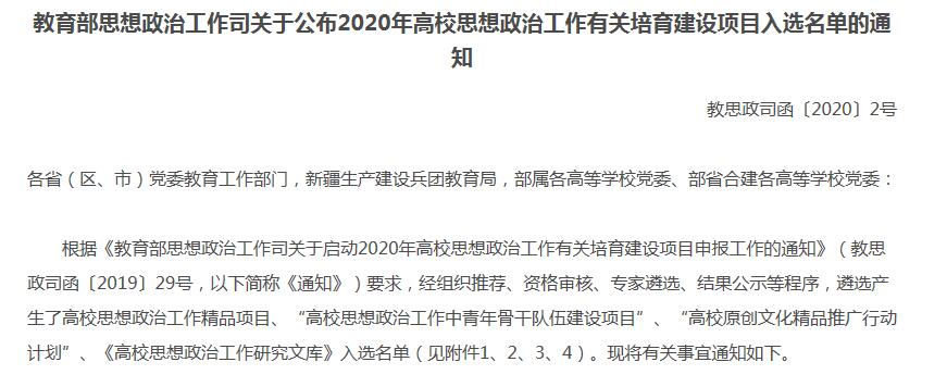 1月8日,教育部思想政治工作司发布《关于公布2020年高校思想政治工作有关培育建设项目入选名单的通知》(教思政司函〔2020〕2号),我校申报的《新机构、新模式、新态势——“三新”网络育人体系的构建与实践》项目入选教育部2020年高校思想政治工作精品项目。