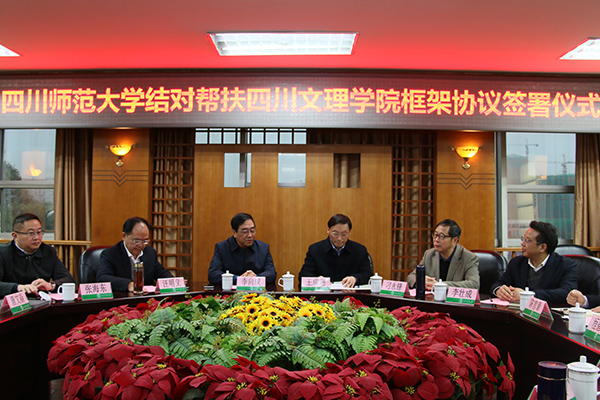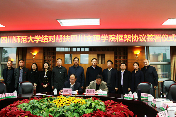 11月22日,学校与四川师范大学举行结对帮扶签约仪式,党委书记王成端与四川师范大学党委书记李向成出席签约仪式并讲话,党委副书记、校长刁永锋与四川师范大学党委副书记、校长汪明义签署帮扶协议。