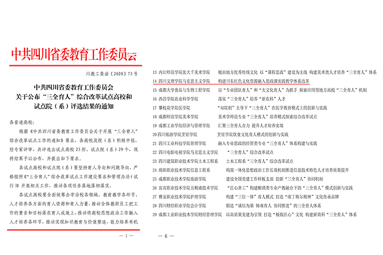 近日,省委教育工委公布了“三全育人”综合改革试点高校和试点院(系)评选结果,我校马克思主义学院成功入选四川省“三全育人”综合改革试点院系。