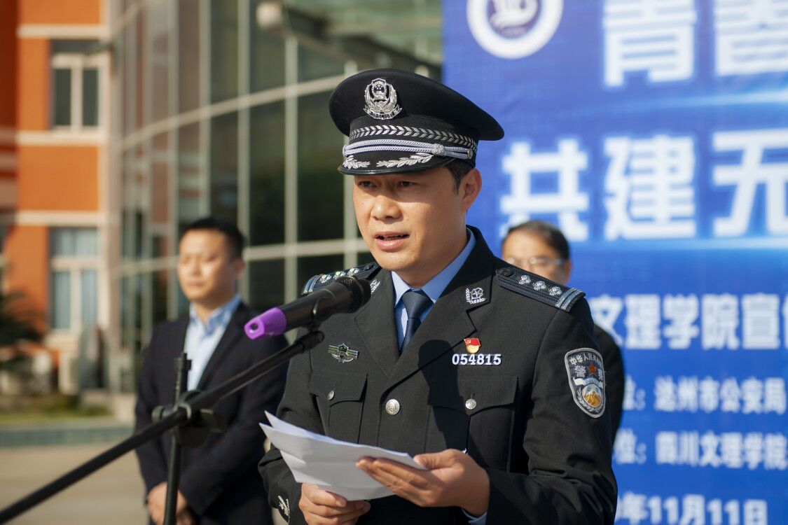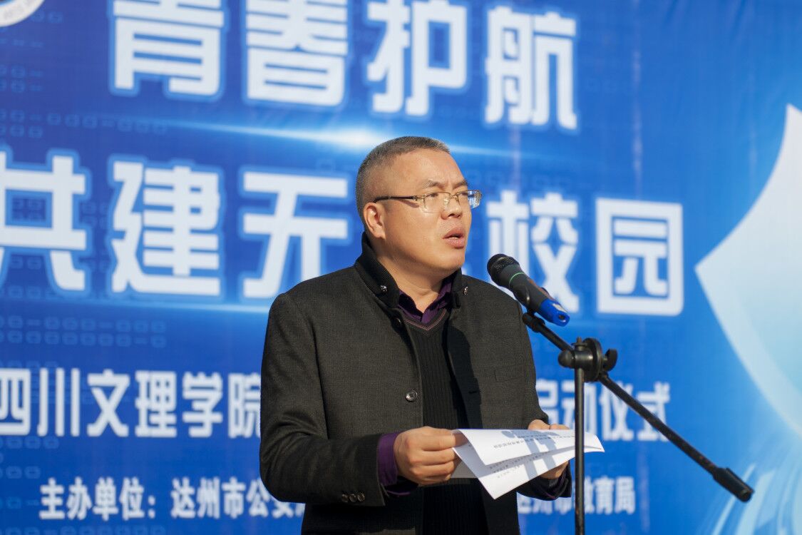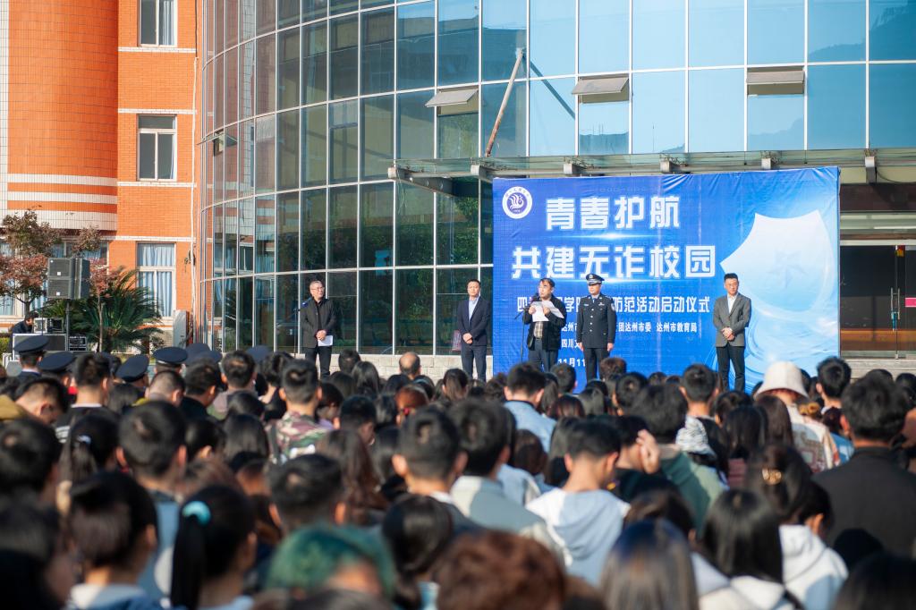 11月11日上午,“青春护航·共建无诈校园”反诈宣传防范活动启动仪式在我校举行。市公安局党委委员、副局长徐应涛,共青团达州市委副书记曾豪,市教育局正县级干部彭刚出席启动仪式,副校长徐晓宗主持启动仪式。
