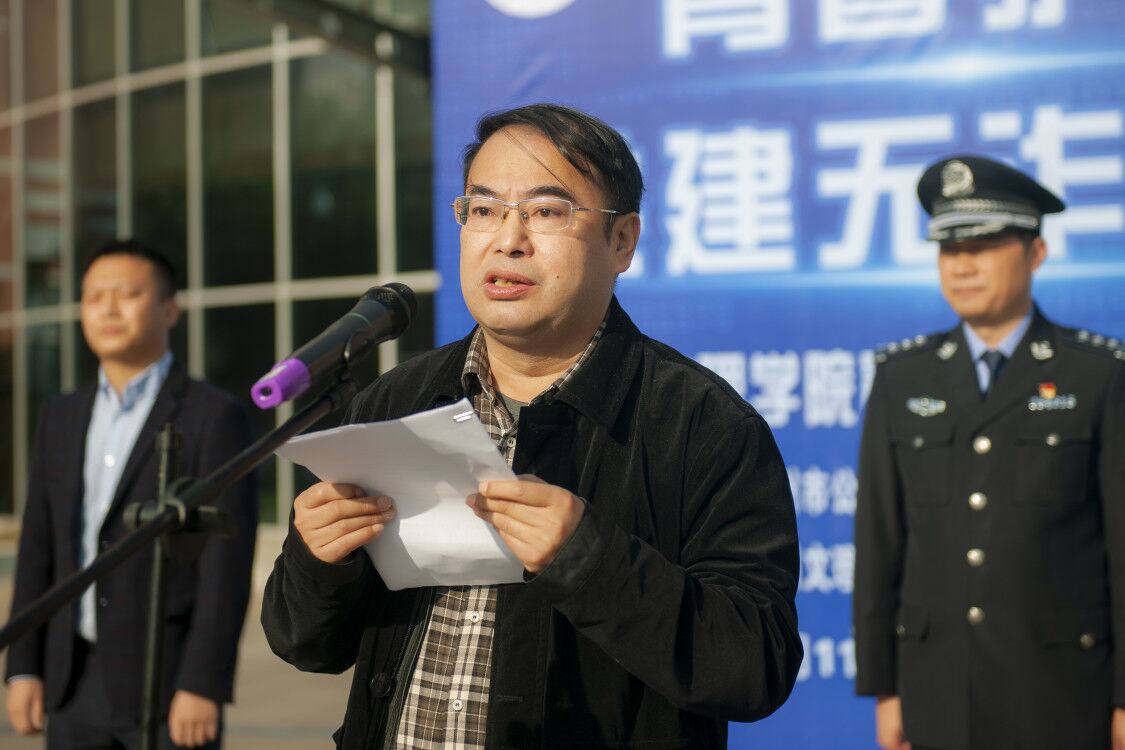 彭刚宣读《关于联合组织开展“青春护航·共建无诈校园”宣传防范活动的方案》,从活动内容、任务分工、工作要求等方面对方案作了解读说明。