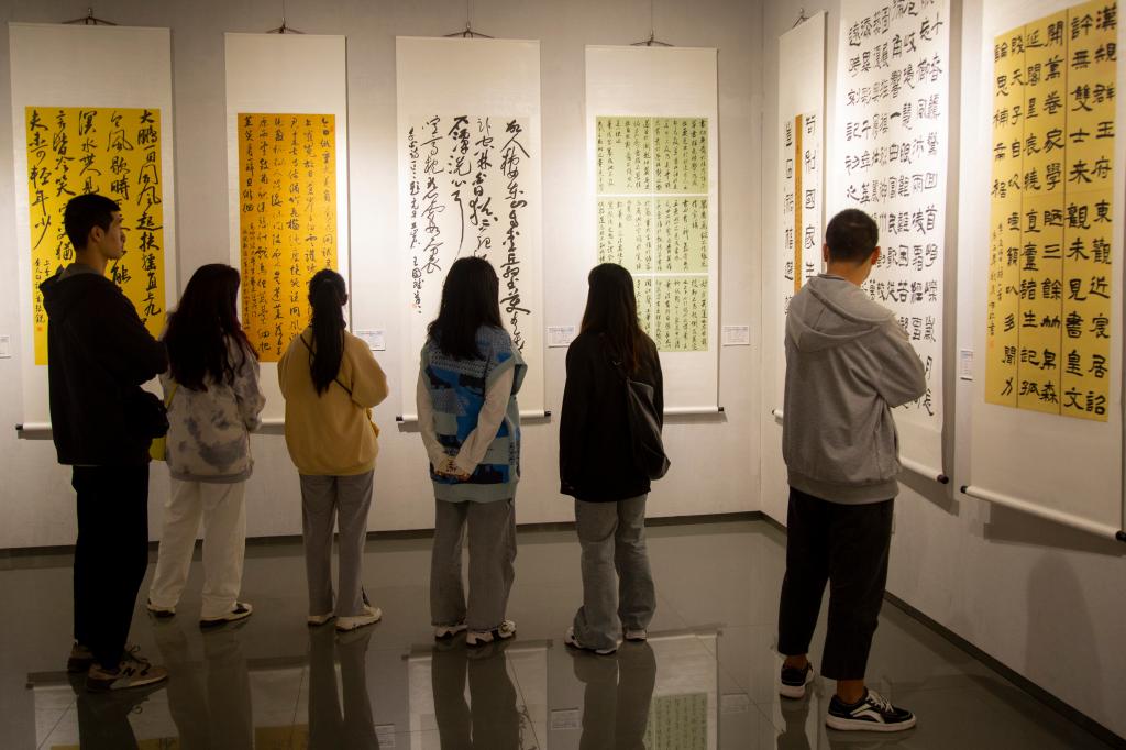 学生参观大艺展书法作品