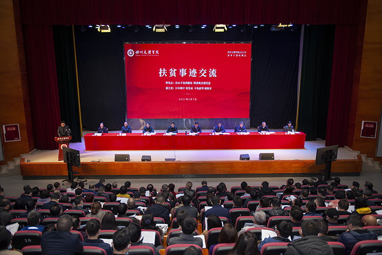 3月7日,我校在莲湖校区艺术传媒大楼多功能厅召开扶贫事迹交流会,传达学习习近平总书记在全国脱贫攻坚总结表彰大会上的重要讲话精神,总结扶贫帮扶工作,并安排部署学校主动服务乡村振兴战略重要举措。党委书记王成端主持会议并讲话,学校扶贫干部曾宪志、蒲江勇两位同志交流汇报扶贫帮扶工作。