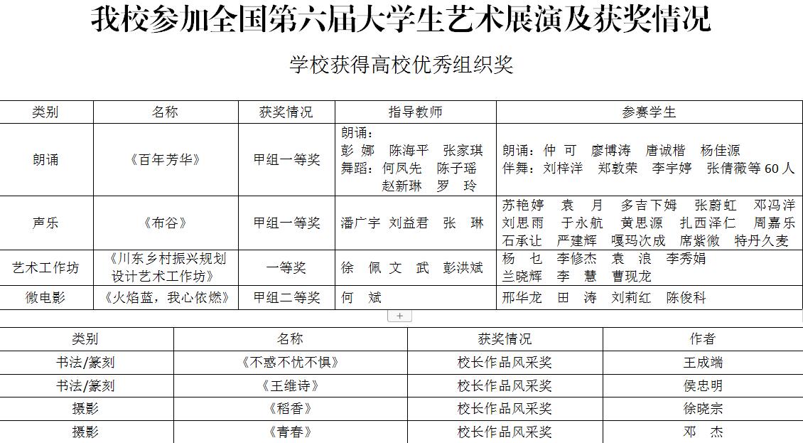 5月12日,全国第六届大学生艺术展演活动在四川成都落下帷幕,我校选送的朗诵《百年芳华》、声乐《布谷》、大学生艺术实践工作坊《川东乡村振兴规划设计艺术工作坊》3项作品荣获一等奖,微电影《火焰蓝,我心依燃》获二等奖,书画《不惑不忧不惧》《王维诗》与摄影《稻香》《青春》4幅作品获高校校长风采奖,学校获高校优秀组织奖,朗诵《百年芳华》受邀参加闭幕式演出。此次大艺展取得的优异成绩,充分展示了学校美育成果和文理学子的精神面貌。