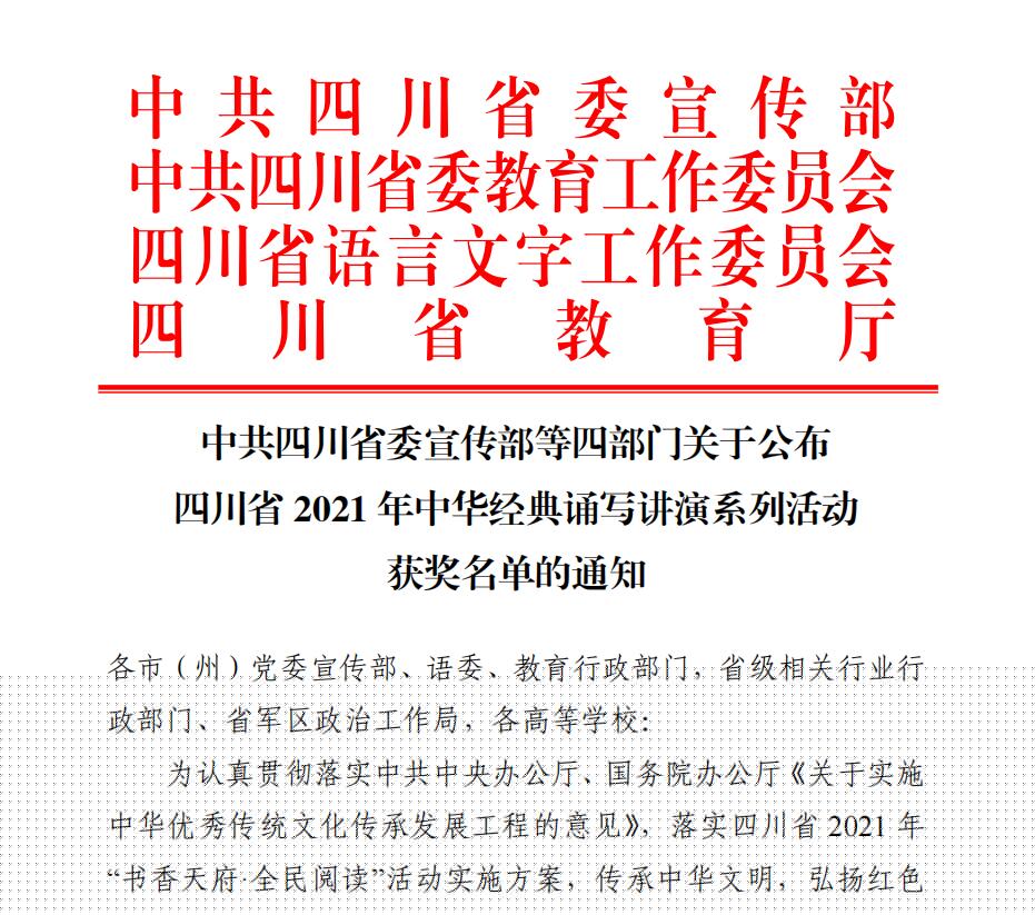 10月12日,省委宣传部、省委教育工委、省语言文字工作委员会、省教育厅联合《公布四川省2021年中华经典诵写讲演系列活动获奖名单的通知》,我校在今年比赛中,共报送35件作品参赛,26件作品获奖,其中获一等奖3件、获二等奖2件、获三等奖9件、优秀奖12件,在全省高校中取得了较好的成绩。