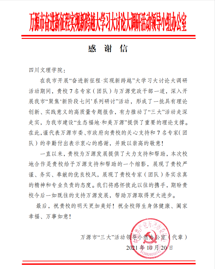 近日,万源市委、市政府向我校发来感谢信,感谢我校专家团队在万源市开展“奋进新征程·实现新跨越”大学习大讨论大调研“三大”活动期间提供的智力支持和援助。