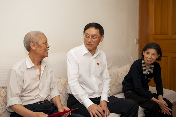 党委书记王成端走进81岁高龄退休老党员黄守毅家中,亲切地与老人拉家常、问寒问暖,详细了解退休老党员的身体、生活和家庭情况,现场帮助解决生活中困难,充分体现了学校党委时刻把老党员的冷暖放在心上,切实让离退休老党员老有所养、老有所乐、老有所为,安心安度晚年。并要求离退休党总支和相关职能部门要高度重视离退休老党员工作,不要忘记发展成果路上老同志的奋斗足迹和奉献精神,关心和照顾好老党员的生活,同时送上了党组织的节日祝福。
