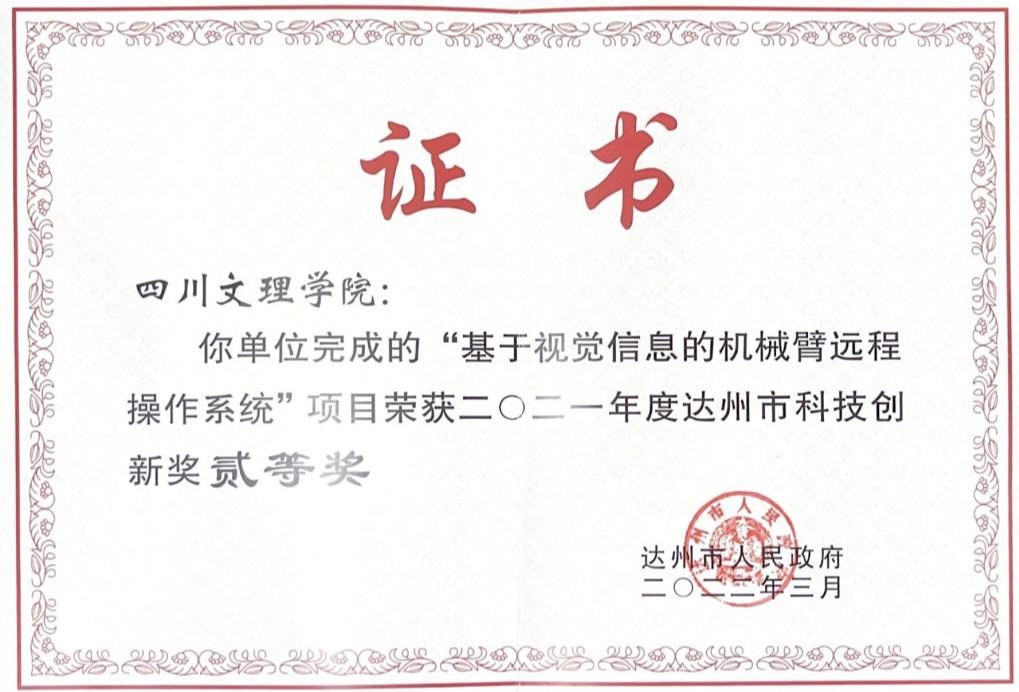 由党委书记王成端教授牵头,化学化工学院研究团队联合达州市质量技术监督检验测试中心、四川轻化工大学共同完成的“多点吸附型高效金属酸洗有机缓蚀剂的合成与应用研究”荣获一等奖。由智能制造学院郝加波教授主持完成的“基于视觉信息的机械臂远程操作系统”荣获二等奖。