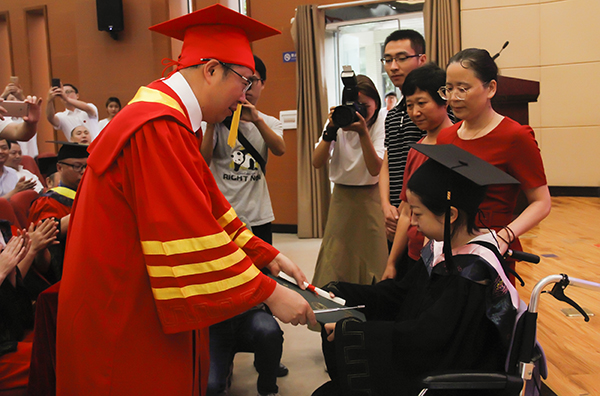 王成端教授、刁永锋教授、侯忠明教授、张超同志、李壮成教授、徐晓宗教授、邓杰教授为获得学士学位的同学拨穗授位。刁永锋还走下主席台,躬身为轮椅上的最美姑娘,教师教育学院陈彦蓉同学拨穗、授位。