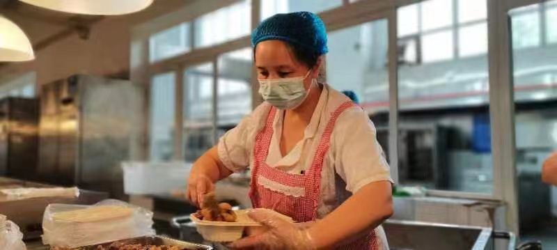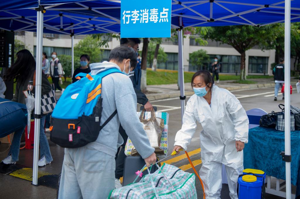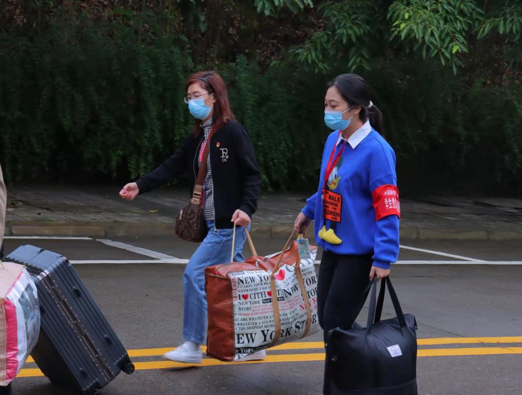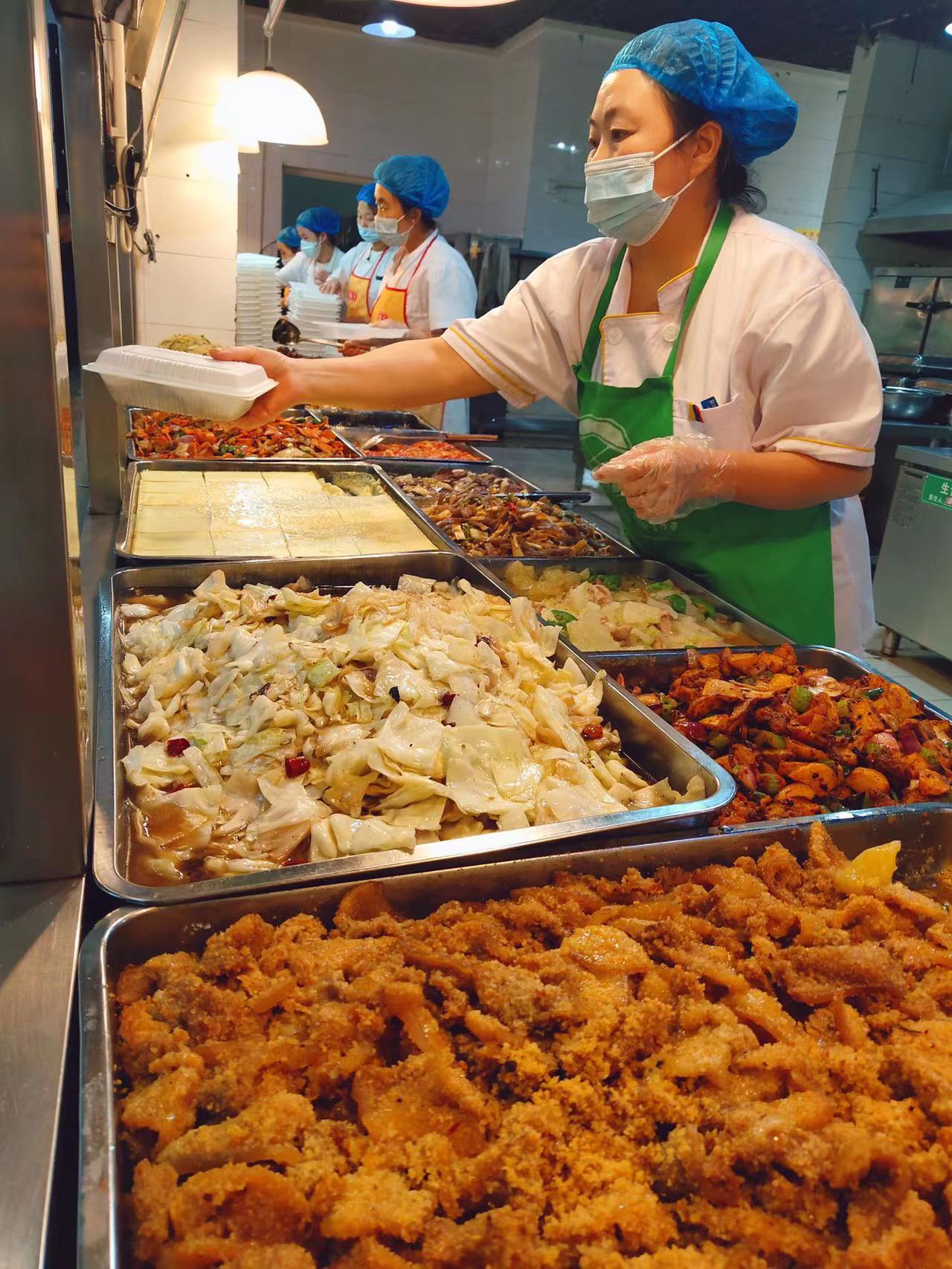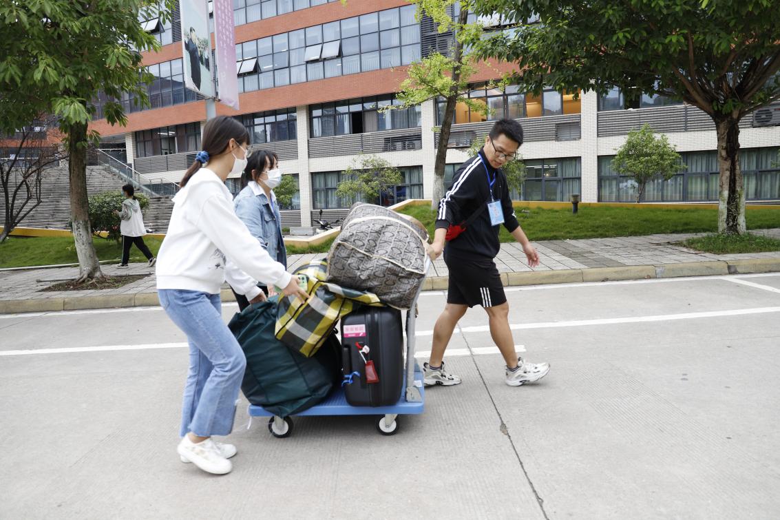 新生刚到学校,就有老师和学长学姐们在下车点迎候,他们运送行李、维护秩序、消毒测温、答疑解惑,分工明确。根据学校疫情防控工作安排,学生入校后3天内不堂食,同学们就排队取餐回公寓吃,看着十几盆色香味俱全的美味佳肴,同学们还有点选择困难。