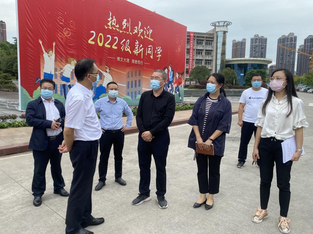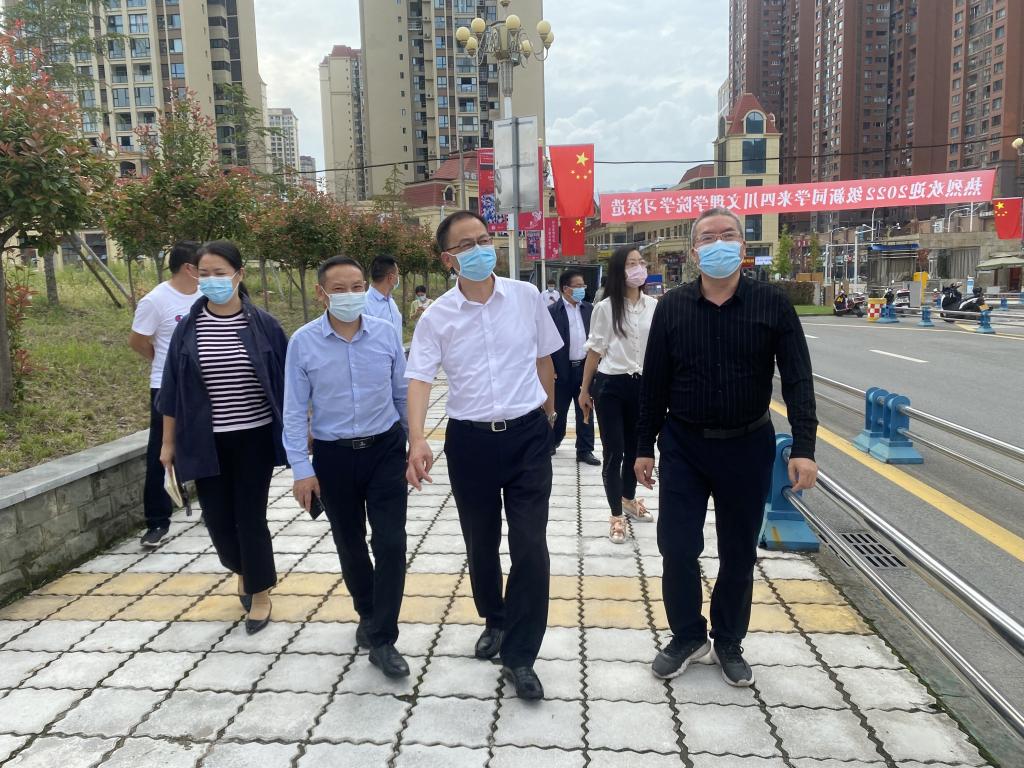 为进一步落实省市疫情防控和开学工作的要求,着力抓好2022年秋季开学工作,9月26日,四川省教育厅二级巡视员杨建国、教育厅党建与干部人才处干部洪婧、教育厅资助中心干部莫笙一行来我校检查指导秋季开学及疫情防控工作。市委教育工委专职副书记冯雷,学校副校长徐晓宗、后勤服务处、人事处、学生处、保卫处等相关负责人陪同检查。