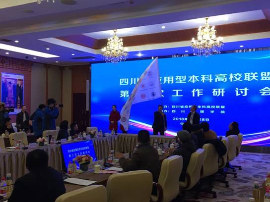 根据联盟理事会的商议,四川省应用型本科高校联盟第四次工作研讨会将于2019年在我校召开。在会议最后阶段,副校长李壮成代表学校接受了联盟会旗,并就办好联盟第四次工作研讨会作表态发言。