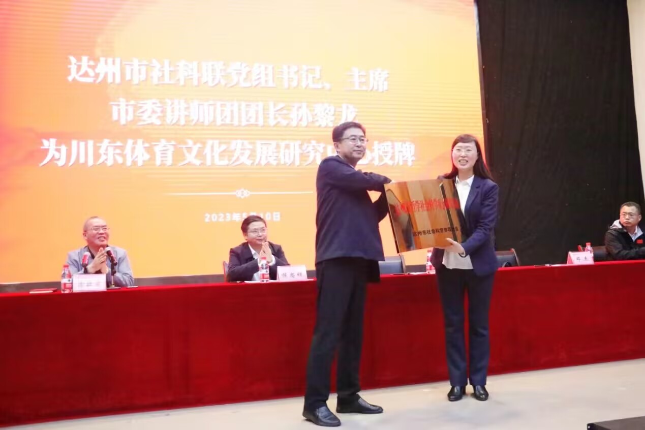 近日,川东体育文化发展研究中心授牌仪式在我校莲湖校区多功能厅举行。达州市社科联主席孙黎龙为研究中心授牌,校长侯忠明讲话,副校长徐晓宗、邓杰,学校相关职能部门负责人、体育学院师生代表参加仪式。