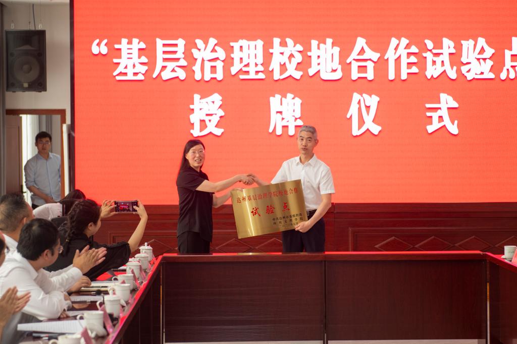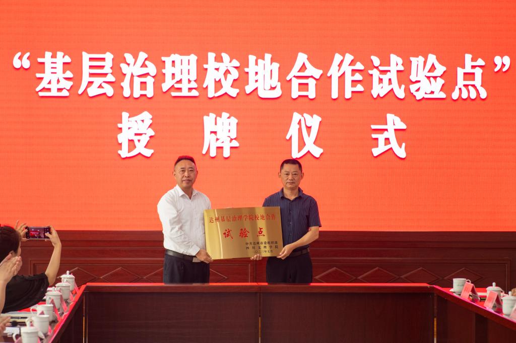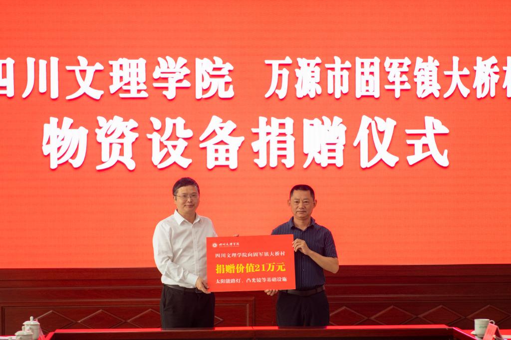 侯忠明代表学校向固军镇大桥村捐赠第二批价值21万元的路灯、凸光镜等设施设备,向万源市检察院颁授“四川文理学院实践教育基地”牌匾;副校长邓杰向万源市检察院颁授“达州基层治理学院校地合作试验点”牌匾,党委组织部部长涂德祥向大桥村颁授“达州基层治理学院校地合作试验点”牌匾。