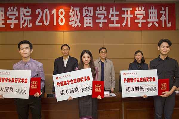 王成端、刁永锋、邓杰及相关领导向2017级、2018级留学生分别颁发四川省外国留学生政府奖学金、四川文理学院校级奖学金。