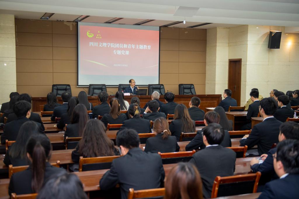 11 月 9 日,党委书记黄涛在莲湖校区弘德楼一楼会议室为青马班学员讲思政课暨团员和青年主题教育专题党课。他强调,要坚持用习近平新时代中国特色社会主义思想凝心铸魂,深入开展面向广大团员和青年的主题教育。四川文理学院只有寄望青春、永葆青春,才能兴旺发达。文理青年只有追梦青春、绽放青春,才能无悔人生。全校广大团员和青年要牢记习近平总书记嘱托,听党话、跟党走,发扬学校“艰难困苦,玉汝于成”的办学精神,努力成长为堪当民族复兴重任的时代新人,在攀登知识高峰中追求卓越,在肩负时代重任时行胜于言,在真刀真枪的实干中成就一番事业。