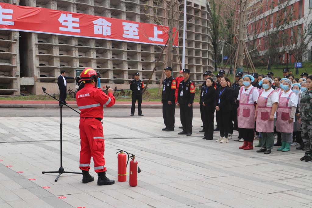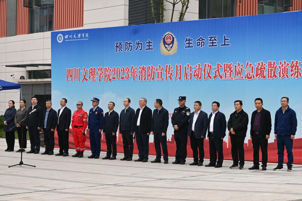 为进一步增强师生安全意识,提高师生逃生自救能力与防火应急处置能力,11月9日上午,学校在莲湖校区东区举办了以“预防为主·生命至上”为主题的消防宣传月启动仪式暨应急疏散活动。学校党委书记黄涛、副校长苟兴龙,达州市应急管理局副局长周嘉荃、达州市消防救援支队指挥中心干部程云波、莲花湖派出所指导员周林、巴山救援队技术总工刘虹曙及校内相关职能部门负责人出席启动仪式并在现场观摩疏散演练,党委常委、副校长徐晓宗主持启动仪式,近5000名师生参加灭火实操及疏散演练。