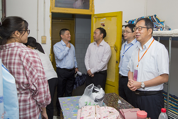 9月12日上午,党委书记王成端、校长刁永峰、党委副书记侯忠明一行冒着大雨来到迎新现场,看望前来报到的新生,并慰问参与迎新工作的师生员工。校领导一行与工作人员仔细查看新生接待工作,党委书记王成端心系家庭经济困难的新生,关心他们的入学报到情况,重点查看了绿色通道和生源地信用助学贷款确认点的工作安排。校长刁永锋在报到点查看各学院的物品和资料准备,深入新生宿舍,与新生亲切交流,询问新生的住宿生活。党委副书记侯忠明在发现有爱心人员冒着大雨义务指挥车辆时,亲自为其送伞。