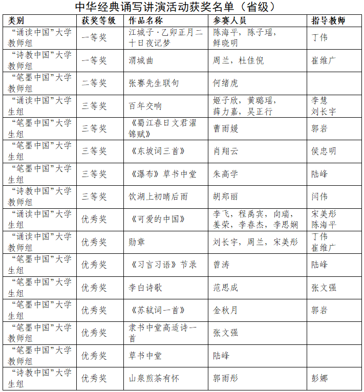 近日,2023年全国、全省中华经典诵写讲演活动比赛结果公布。在本次比赛中,学校共获奖23项,其中,获全国一等奖1项、三等奖4项、优秀奖2项,获全省一等奖2项、二等奖1项、三等奖5项、优秀奖8项。