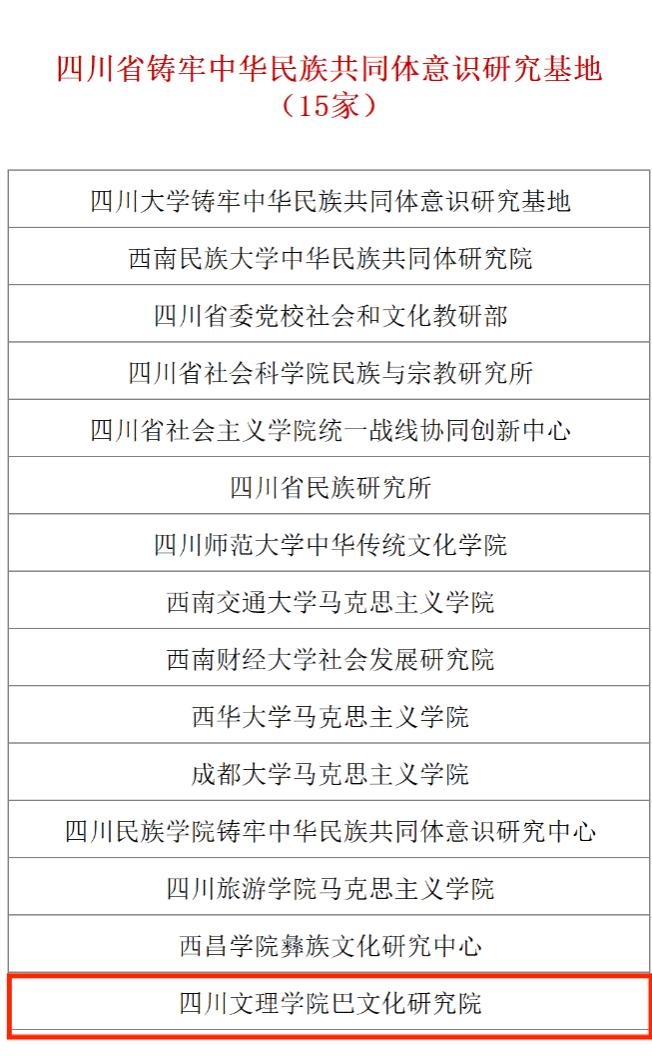近日,四川省委统战部、省委宣传部、省教育厅、省民族宗教委联合印发了《关于命名全省铸牢中华民族共同体意识研究(培育)基地(2023—2025年)的通知》,命名全省首批15家铸牢中华民族共同体意识研究(培育)基地,我校巴文化研究院名列其中。