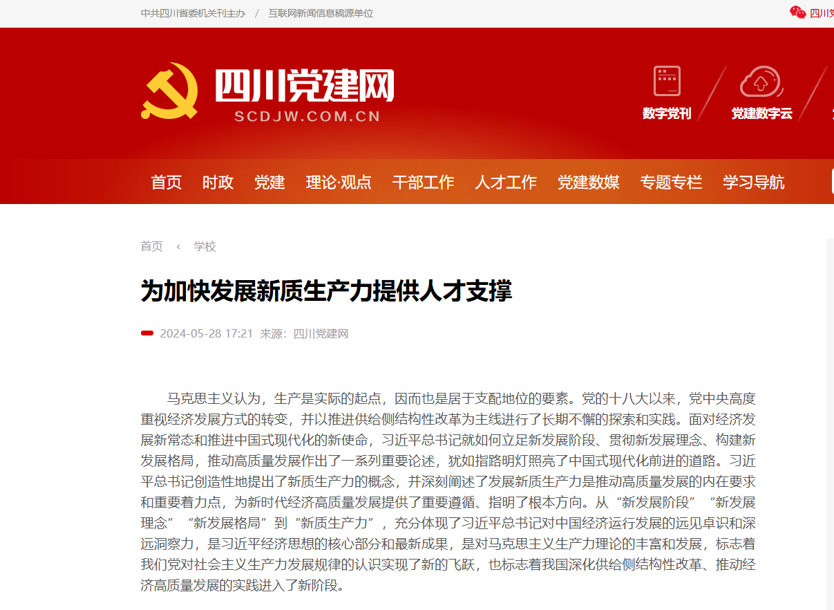 5月28日,四川党建网刊载我校党委书记黄涛的文章《为加快发展新质生产力提供人才支撑》,介绍我校为加快发展新质生产力提供人才支撑所实施的“4个创新”举措。