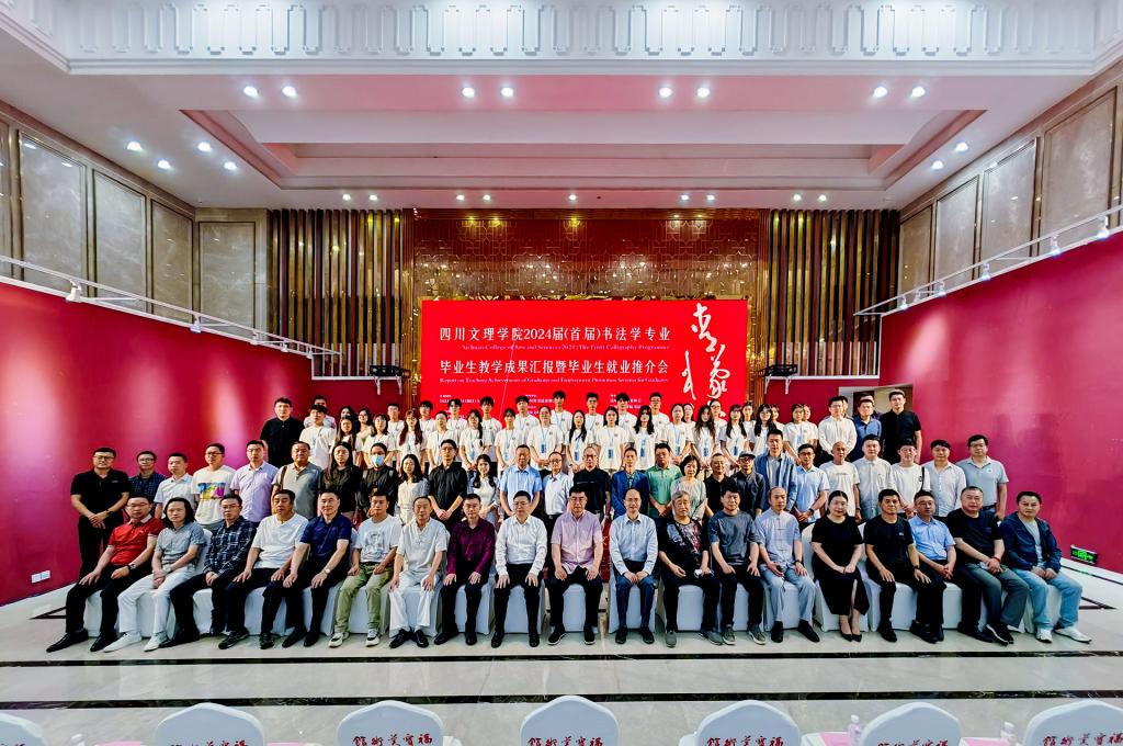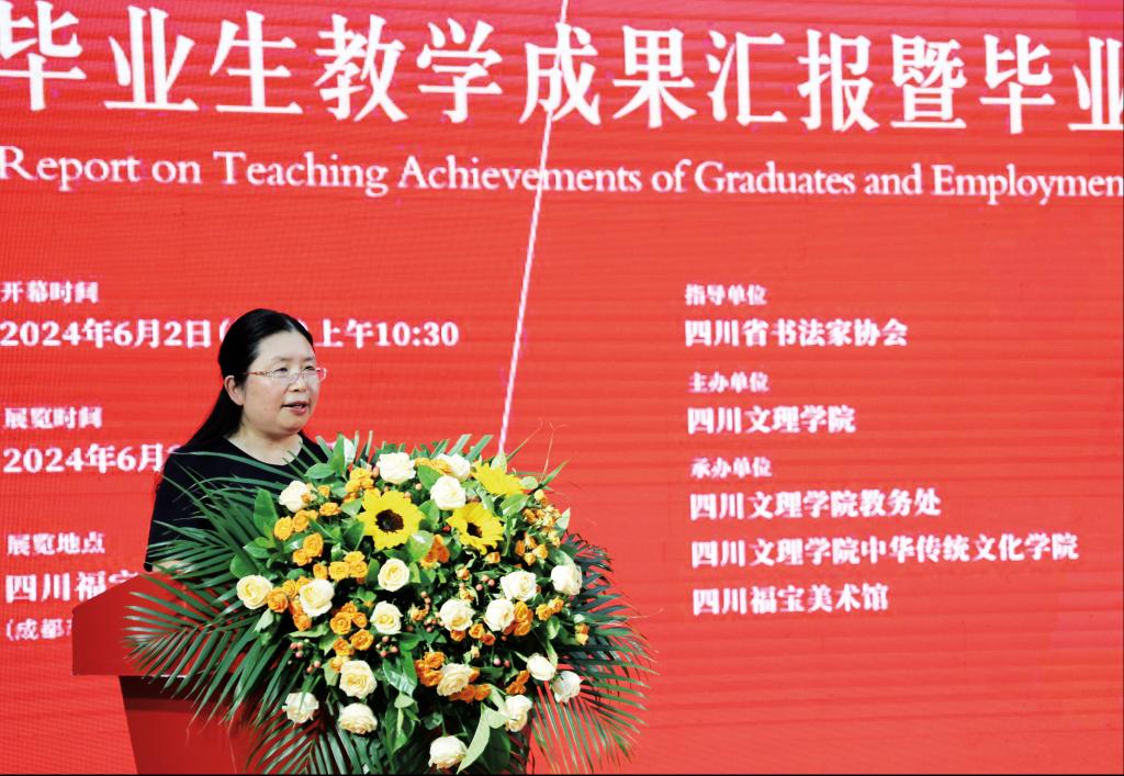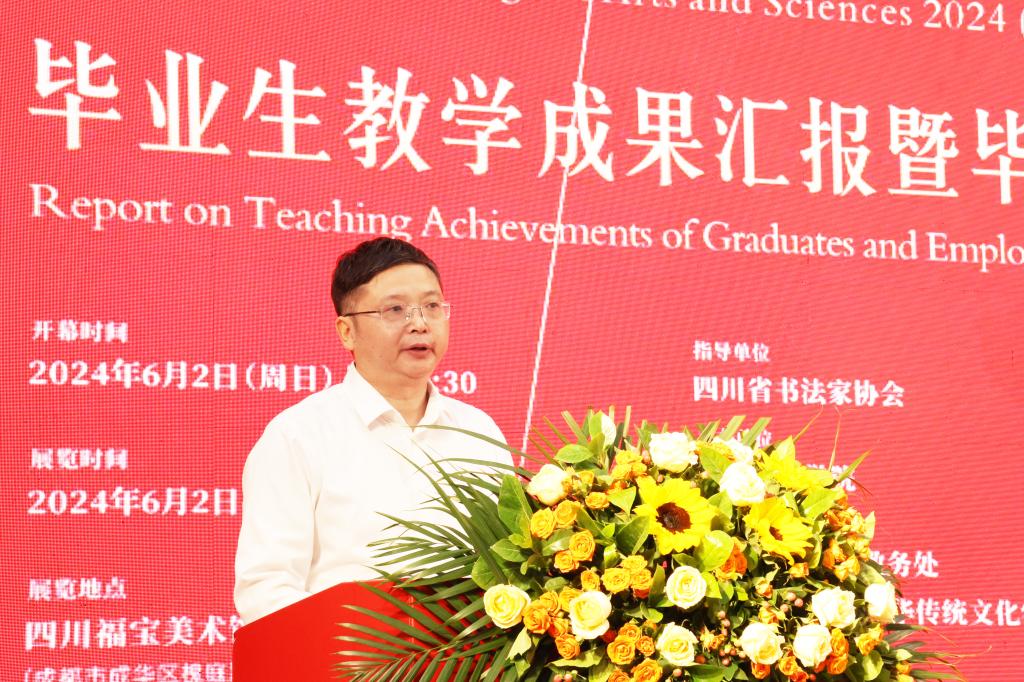 6月2日,我校“青檬流光”——2024届(首届)书法学专业毕业生教学成果汇报暨毕业生就业推介会在四川福宝美术馆举行,中国书协副主席、四川省文联副主席、四川省书协主席戴跃出席讲话并宣布活动开幕,党委书记黄涛出席,校长侯忠明致辞,副校长程碧英主持开幕式,省市书协领导、书法艺术界专家、兄弟高校书法教育工作者,以及我校实践教育单位嘉宾和师生200余人共襄盛会。