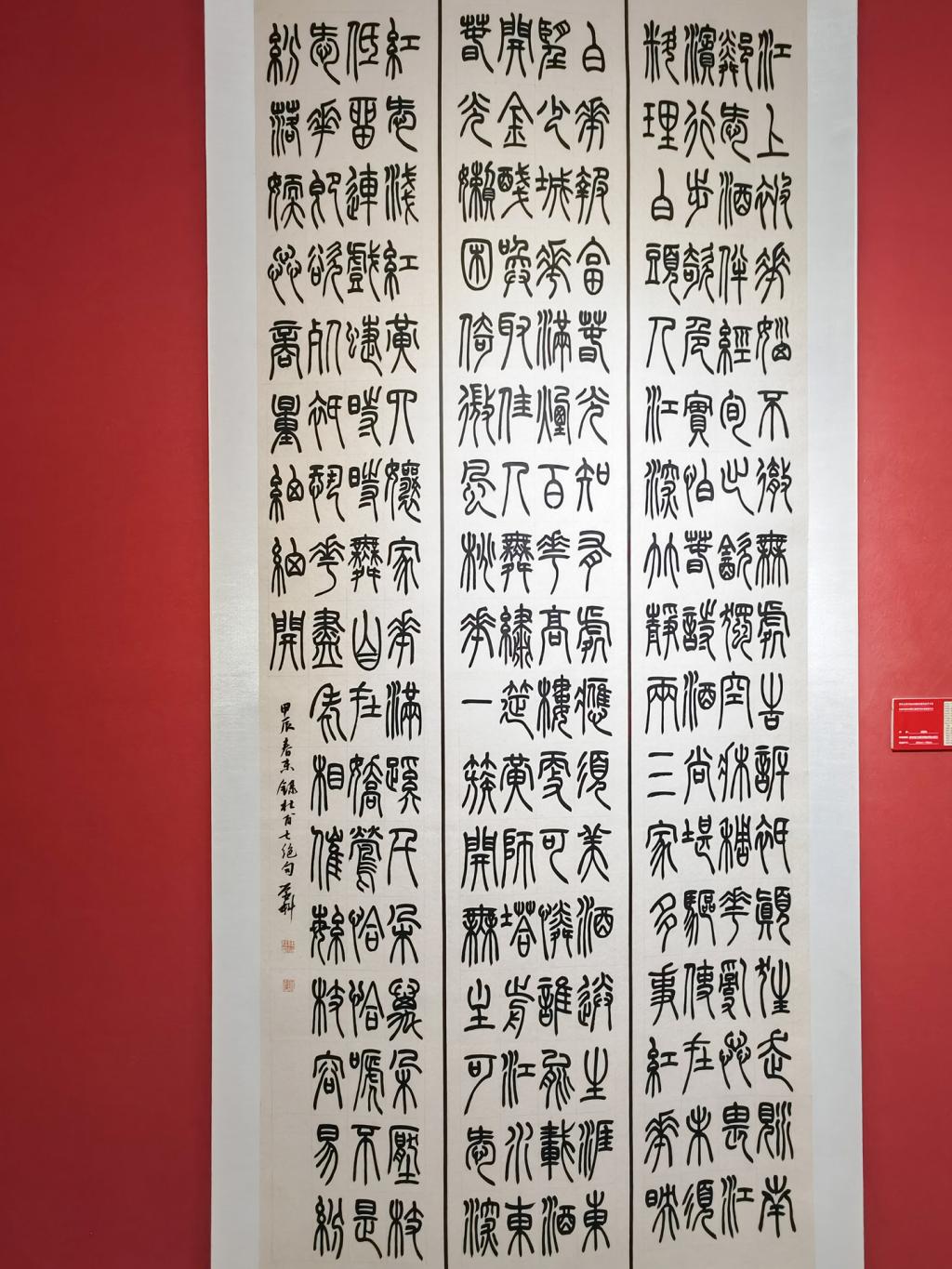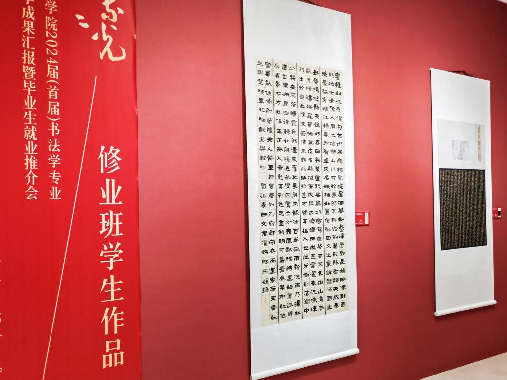 据悉,本次教学成果汇报展时间为6月2日至6月7日,面向社会开放。展品包括我校书法学专业30名毕业生创作的91件书法篆刻作品和修业班学生的11件作品,另有谢和平、侯开嘉、何开鑫、冯恩旭、刘锁祥、戴文、金玟廷、杨帆、马骏华、刘志超、陈沫吾等书法界前辈、专家和我校专兼职教师的24件书法作品参加展览,为观众奉献了一场书法艺术盛宴。