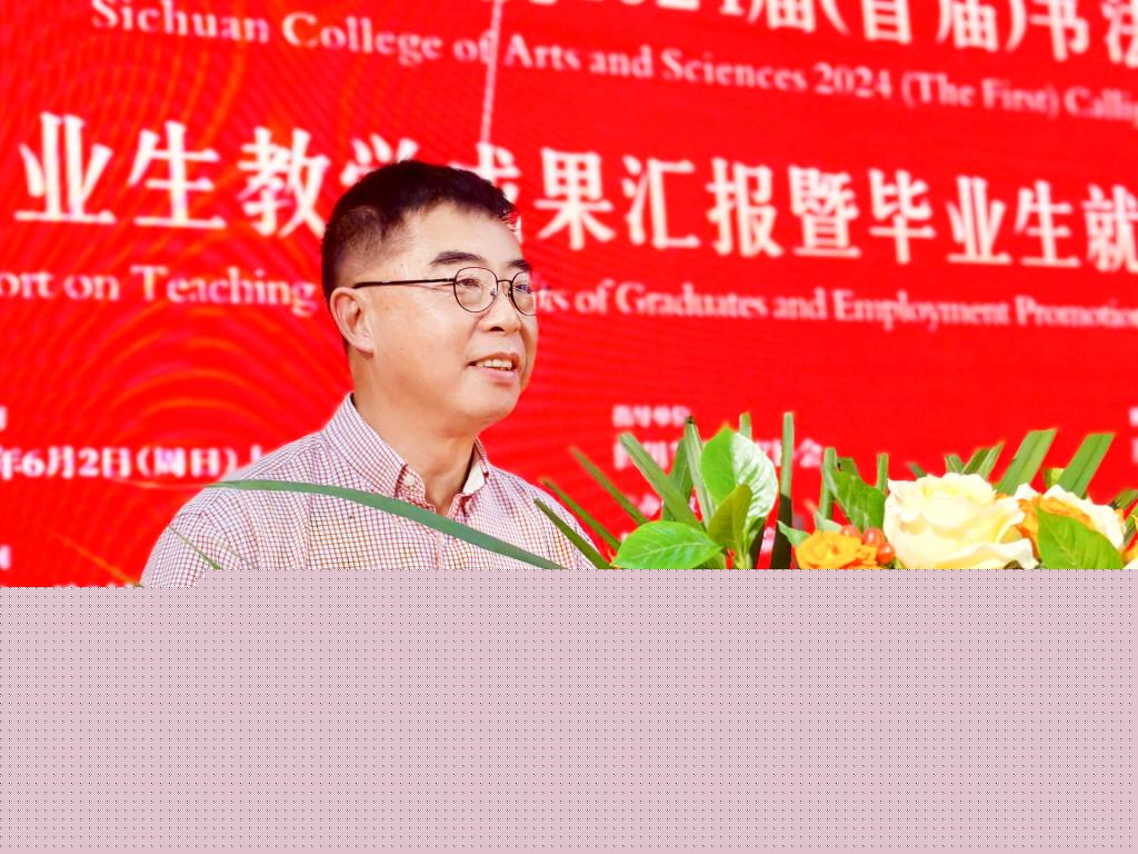 侯忠明对莅临现场的领导嘉宾表示热烈欢迎,对关心支持我校书法学专业建设和人才培养工作的省市书法艺术界领导专家、兄弟高校书法教育工作者以及关心学校建设发展的社会各界朋友表示感谢。他说,四川文理学院十分重视中华优秀传统文化的传承创新,开办书法学本科专业,成立中华传统文化学院并加强建设,实施学科引领,集聚人才,着力培养“技道均衡、艺文兼备、德艺双馨、有中国学问”的新时代书写者,取得了一定的成绩。他指出,举办本次活动,旨在为全省书法教育高质量发展提供文理探索,为书法学专业毕业生提供就业平台,拓展就业空间。他欢迎全省相关单位来校选聘毕业生,并希望全体书法学专业学生继续坚持热爱的书法事业,扎根巴蜀大地,当好中华优秀传统文化的继承者、传播者、创新者。