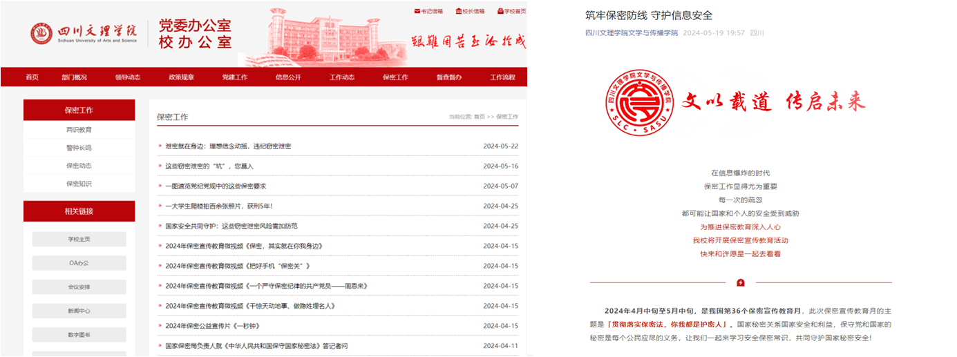 学校保密办官网、各二级学院微信公众号每周定期发布保密知识,帮助师生利用“碎片化”时间进行保密知识学习