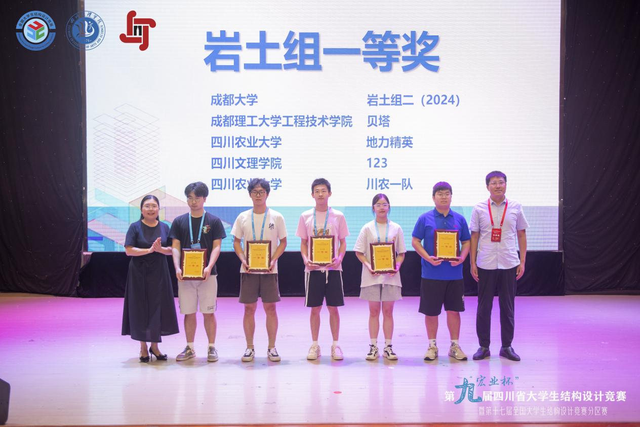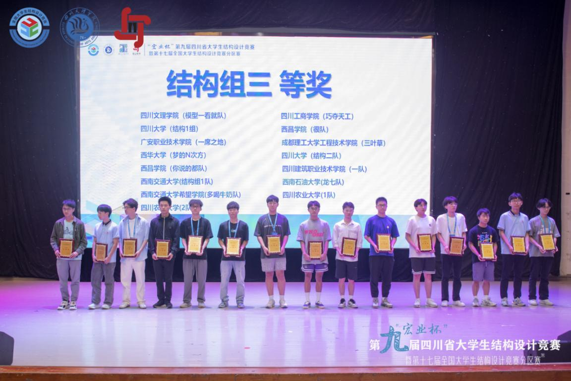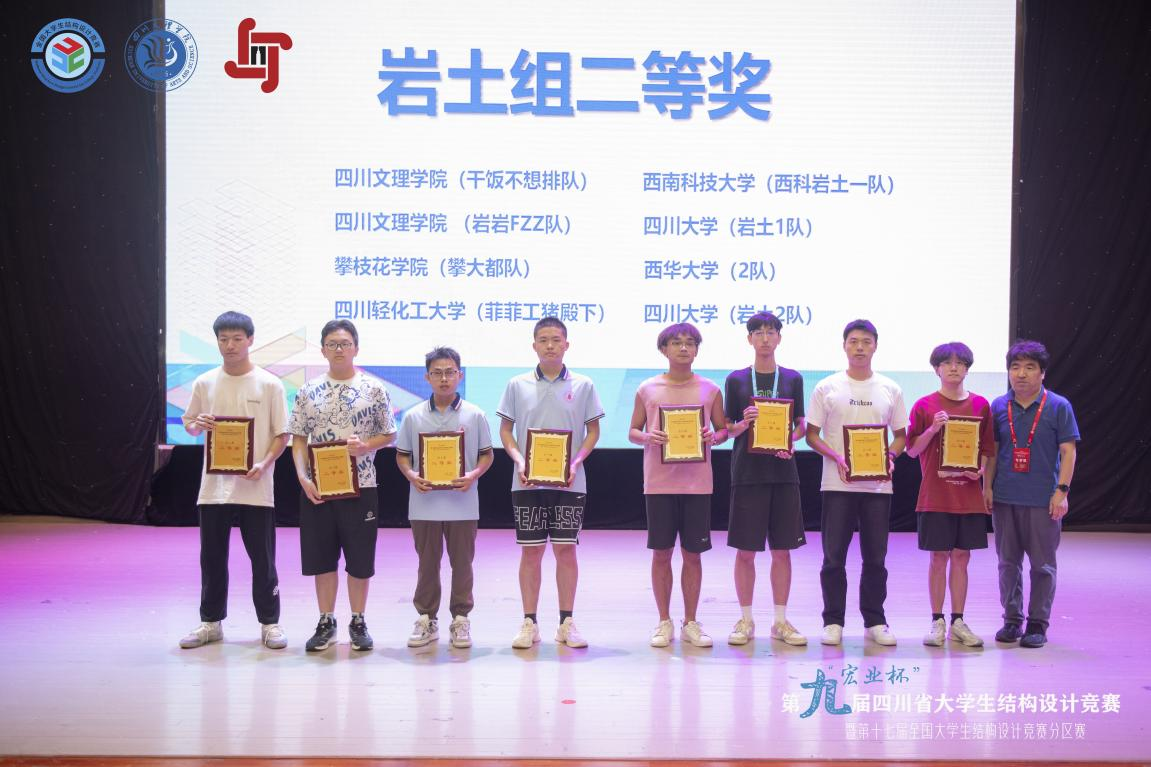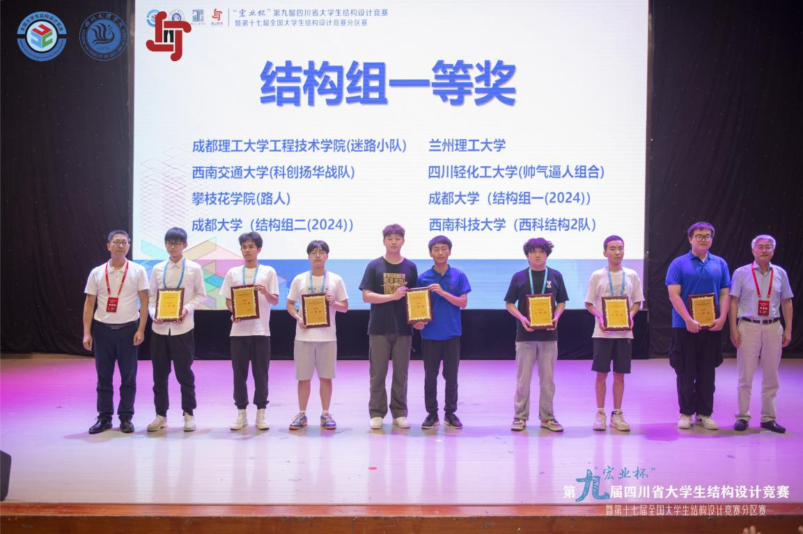 据悉,来自四川大学、西南交通大学等24所高校74支队伍进行了为期四天的激烈角逐,经过专家们公平公正公开的严格评审,本次竞赛最终评选出结构组一等奖8个、二等奖11个、三等奖15个;岩土组一等奖5个、二等奖8个、三等奖13个。特邀高校兰州理工大学获结构组一等奖和岩土组三等奖。四川轻化工大学等10所高校获优秀组织奖。成都理工大学工程技术学院等7所高校的8支队伍获结构组一等奖,成都大学等4所高校的5支队伍获岩土组一等奖,将有3支队伍代表四川省参加第十七届全国大学生结构设计竞赛。