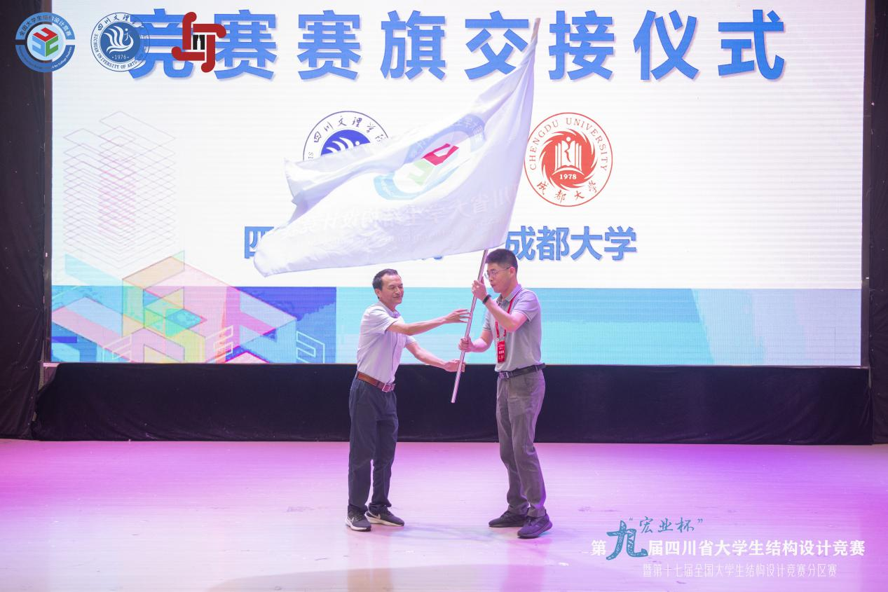闭幕式上,结构组评委专家组长西南交通大学潘毅教授和岩土组评委专家组长成都理工大学路军富教授分别进行了精彩点评,由潘毅教授进行了赛事总结并宣布了组委会奖项设置以及国赛资格推荐办法。组委会和专委会专家为本次竞赛获奖高校和参赛队伍颁奖。会上宣布了下一届承办高校为成都大学,并顺利进行了赛旗交接仪式。下一届承办高校代表成都大学建筑与土木工程学院副院长董建辉教授表示,有信心办好下一届竞赛,尽全力为各参赛高校和队伍做好服务。