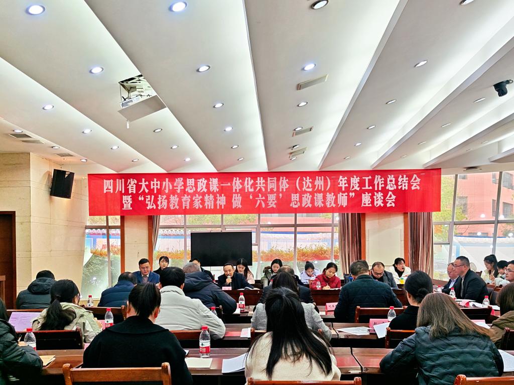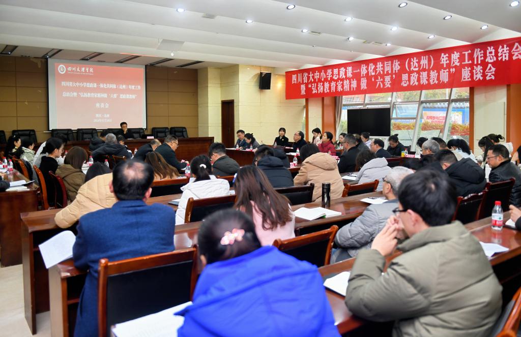 为深入学习贯彻习近平总书记在学校思政课教师座谈会上重要讲话精神和全国教育大会精神,引导广大思政课教师争做“六要”好老师,12月18日,四川省大中小学思政课一体化共同体(达州)年度工作总结会暨“弘扬教育家精神 做‘六要’思政课教师”座谈会在我校召开,会议总结回顾一年来共同体建设发展情况并安排部署2025年重点工作。达州市委教育工委专职副书记冯雷、学校副书记徐晓宗等参加会议并讲话,会议由党委宣传部部长周頔主持。