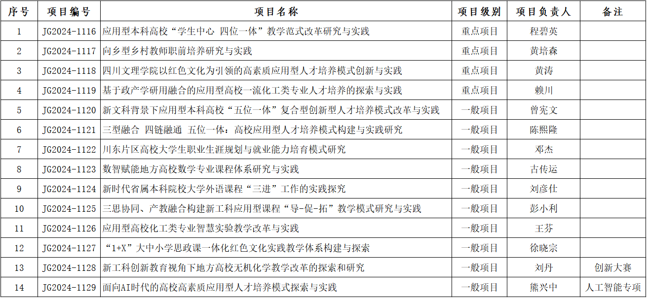 近日,四川省教育厅发布了《四川省教育厅关于公布2024-2026年四川省高等教育人才培养质量和教学改革项目立项名单的通知》(川教函〔2025〕15 号),我校获批立项项目14项,其中重点项目4项、一般项目10项。