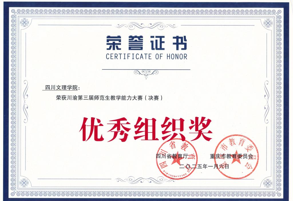 在四川省教育厅、重庆市教育委员会组织的川渝第三届师范生教学能力大赛中,我校凭借广泛动员、积极参与和优秀的竞赛成绩,荣获“优秀组织奖”称号。
