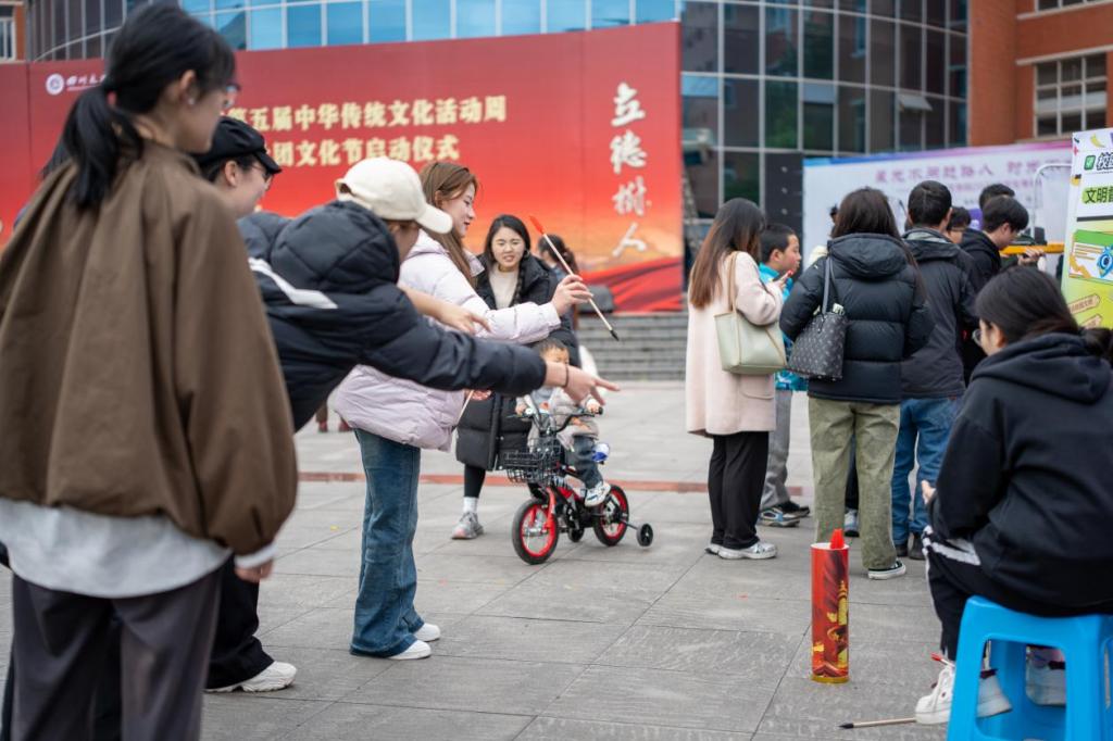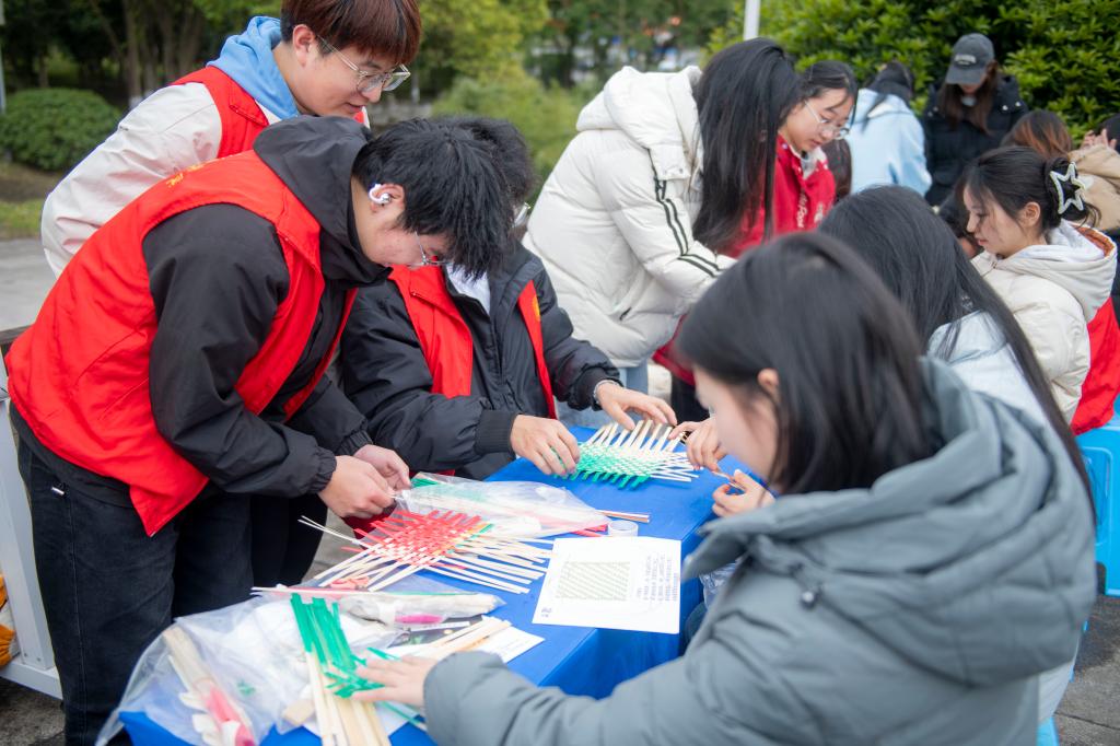 据悉,学校现有112个学生社团,实现了“万人百团”的目标,涵盖思想政治、学术科技、创新创业、志愿公益、文化体育、自律互助等类别。活动现场除了有各社团的风采展示外,还开展了传统文化类学生互动展演和各种各样沉浸式体验活动。活动设有古筝二胡、书法篆刻、趣味投壶、棋类博弈、竹编扇子DIY、茶艺展示、飞花令等多种项目,这一系列丰富多样的传统文化活动,吸引了众多师生驻足体验,在互动中深度感知中华优秀传统文化的魅力。