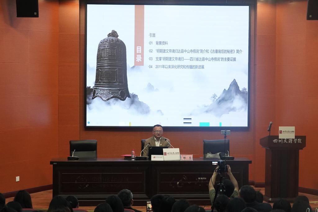 本次活动主讲嘉宾由四川省方志文化宣讲队成员、四川省地方志学会理事、四川省巴文化研究会理事邓高担任,他以《“明朝建文帝隐居达县中山寺说”大揭秘》为主题,从中国历史七大悬案切入,以方志古籍、碑刻影像及中山寺实地考察为证据链,从“明朝建文帝魂归达县中山寺假说”背景资料、《古墓背后的秘密》简介、明建文帝下落争鸣、2011年以来研究和传播新进展四个部分,系统解析这一历史谜题,论证《古墓背后的秘密》中提出的“魂归达县”假说合理性。邓高通过详实的史料和多元化的证据对假说进行解析和求证,以细致生动的解说揭开历史谜题,极具说服力和吸引力,展现了方志文化的魅力和底蕴,赢得了在场师生及广大网友一致好评。
