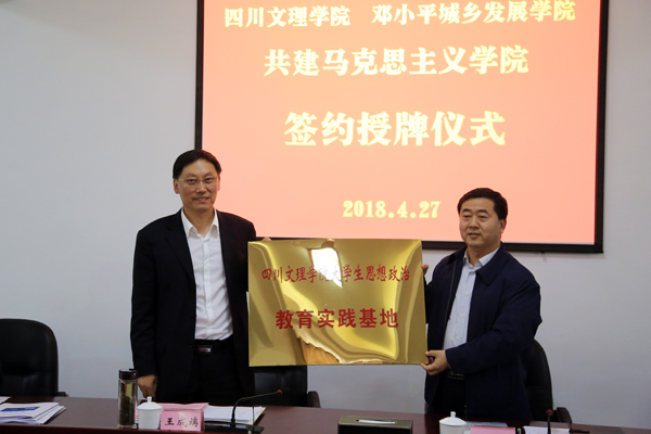 会上,学校与邓小平城乡发展学院签署了共建马克思主义学院协议,党委书记王成端向邓小平城乡发展学院陈锁明校长授大学生思想政治教育实践基地牌。两校将在红色教育、爱国主义教育、红色文化研究、巴文化研究、社会主义核心价值观宣传教育、生态文明建设、乡村振兴等领域广泛开展科学研究、学术交流、人才培养、优势学科共建以及特色教材编写等多层次的交流与合作。