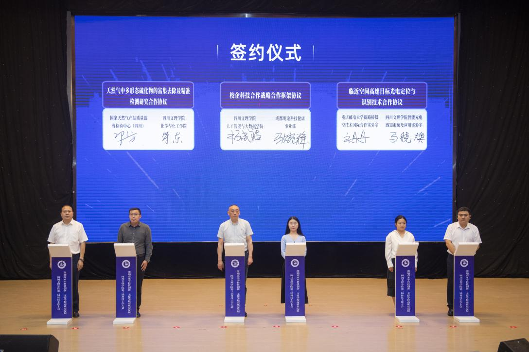国家天然气产品质量监督检验中心(四川)、成都明途科技、重庆邮电大学新路桥低空技术国际合作实验室、两江新区春芽文化艺术工作室、四川九正鼎盛城乡建设集团有限公司、达州中域乾坤信息科技有限公司与学校相关部门签署合作协议,签约总金额近1000万元。