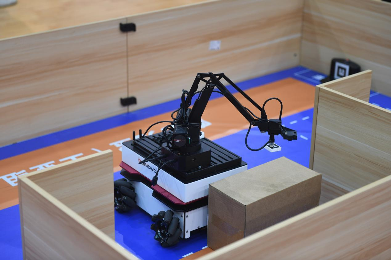 在物流小车项目区,一组来自西南石油大学团队带来的“智能物料分拣机器人”成为焦点——只见机器人通过视觉识别系统精准定位不同颜色、形状的物料,机械臂以毫米级精度完成抓取、搬运与分类投放,全程仅用1分10秒便完成复杂流水线任务,其流畅的动作与高效的算法引得现场评委频频点头。