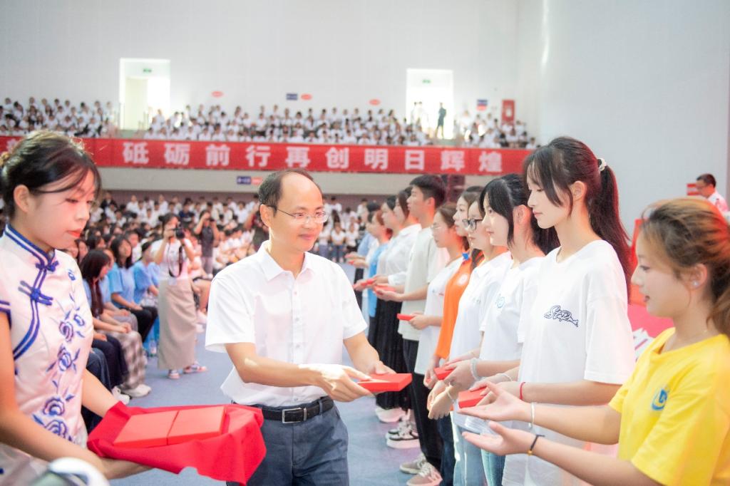 黄涛为新生代表们一一佩戴上象征文理人身份与荣耀的校徽。这枚小小的徽章承载着学校厚重的历史、文化精神和对每一位新学子的殷殷期望。佩戴上它,意味着2025级新生正式融入了文理大家庭开启大学之旅,肩负起知识传承与创新的责任使命。