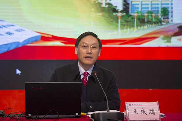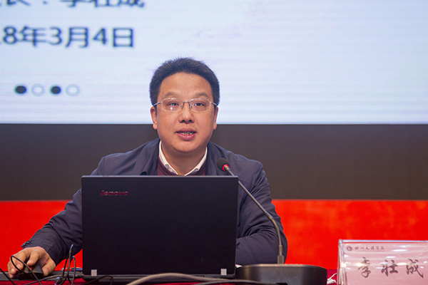 副校长李壮成以《建设高素质、专业化、创新型教师队伍的行动指南》为题,对中共中央、国务院新近出台的《关于全面深化新时代教师队伍建设改革的意见》作了解读,并结合意见精神、本科教学工作审核评估、学校十三五规划以及学校2018年党政工作要点,就学校师德建设教师能力提升、教师队伍管理体制机制等提出了思考。