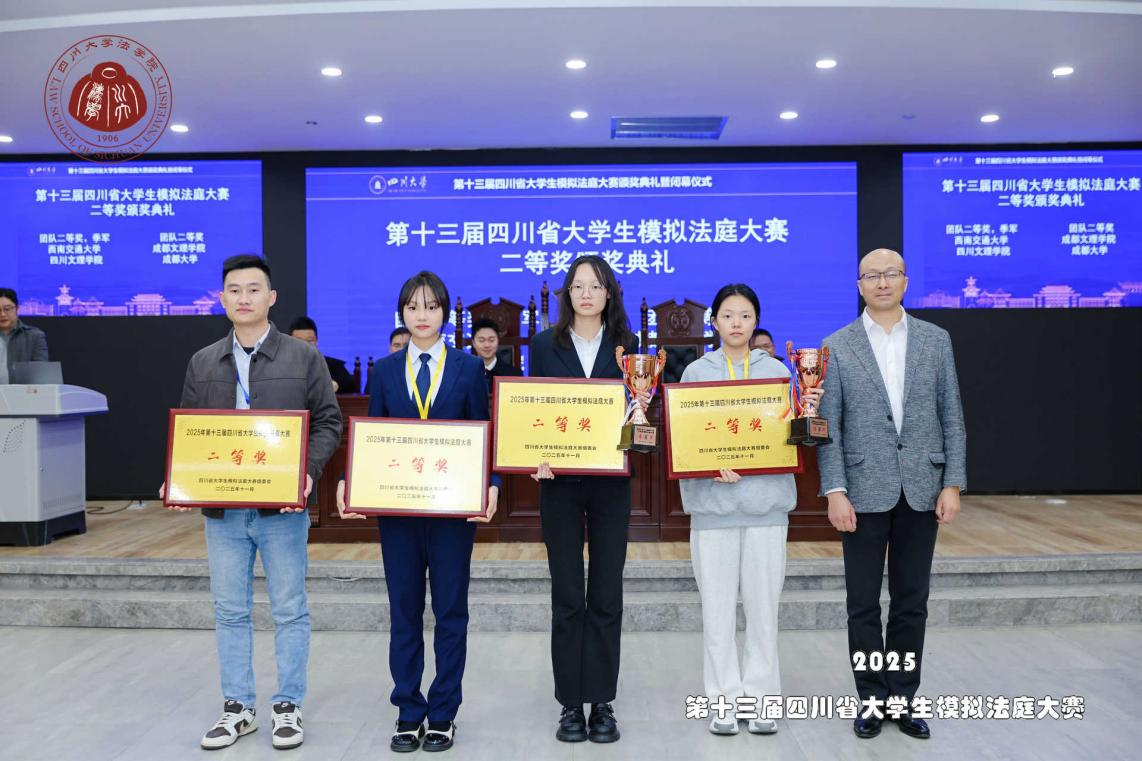 11月22至11月23日,2025年第十三届四川省大学生模拟法庭大赛在四川大学圆满落幕。四川省大学生模拟法庭竞赛是省内法学教育界最具影响力和权威性的赛事之一,旨在通过模拟真实法庭审判,全面考查学生的法律专业能力、逻辑思辨能力、语言表达能力和临场应变能力。本届模拟法庭大赛吸引了包括四川大学、西南财经大学、西南交通大学在内的全省25所高校的优秀法科学子同台竞技。我校知识产权专业代表队凭借出色的专业素养与卓越的庭辩风采,在激烈的角逐中力挫群雄,最终荣获大赛二等奖、季军。这一辉煌战绩不仅刷新了我校在该项赛事中的历史纪录,更标志着我校在培养高素质法律专业人才的道路上实现了里程碑式的重大突破。