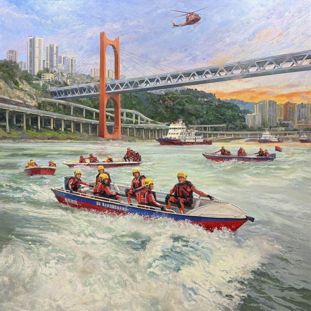 此外,我校美术学院赵岩联合创作的油画作品《渝水守望》通过复评,成功入选。本次创作是一次成功的跨校艺术协作,是中国美术家协会对该作品艺术水准与思想内涵的高度认可,也是我校美术学科建设与创作实力的重要体现。这不仅展现了我校教师出色的专业能力,也体现了高校间艺术资源共享、协同创新的良好局面。