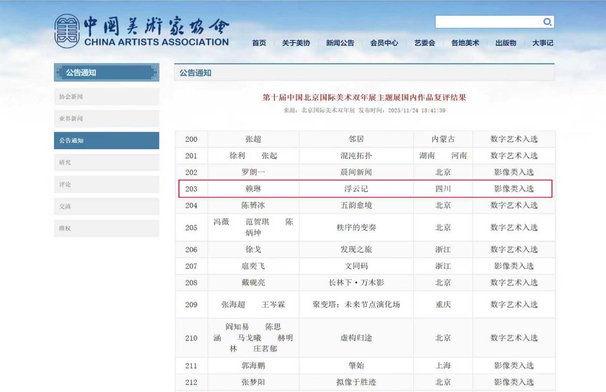 第十届中国北京国际美术双年展复评结果近日揭晓,我校美术学院赖琳副教授创作的影像作品《浮云记》成功入选本届双年展影像类主题展览。该作品为一套综合性艺术系列,包括一部4K超高清油画动画短片(时长5分48秒)、1226幅原创写意油画、6首动画原声音乐、相关衍生品开发以及沉浸式数字艺术影像展演。本届双年展影像类全国入选作品仅9件,此次入选是继2005年美术学院王毅副教授油画作品《山沟沟》参展第二届北京国际双年展后,我校再次有作品登上这一国际艺术舞台。