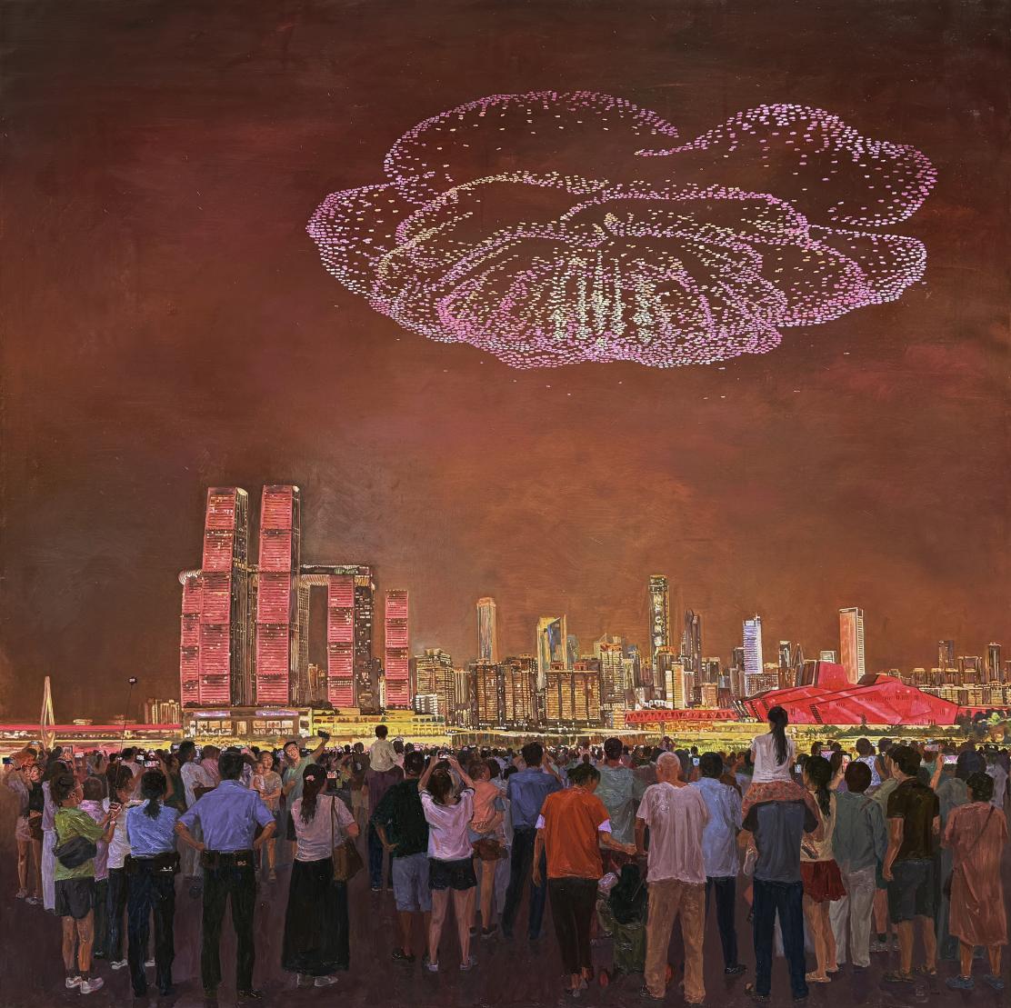 作品《低空经济》紧扣“低空经济”这一时代主题,将传统油画技法与现代科技题材相融合,体现出艺术家对当代社会发展的敏锐洞察与艺术表达能力。