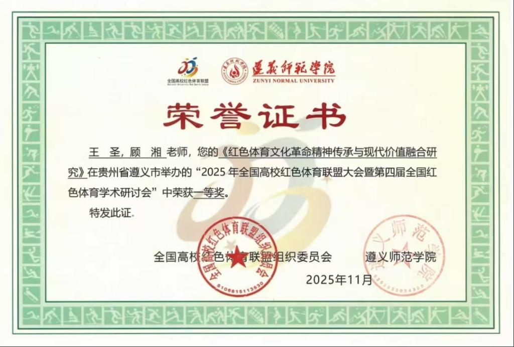近日,全国高校红色体育联盟大会暨第四届全国红色体育学术研讨会在遵义师范学院召开。体育学院王圣博士受邀参会,他以《红色体育文化革命精神传承与现代价值融合研究》为题,在此次研讨会上作专题报告并荣获一等奖,他的报告成为学院深化红色育人实践的重要成果。