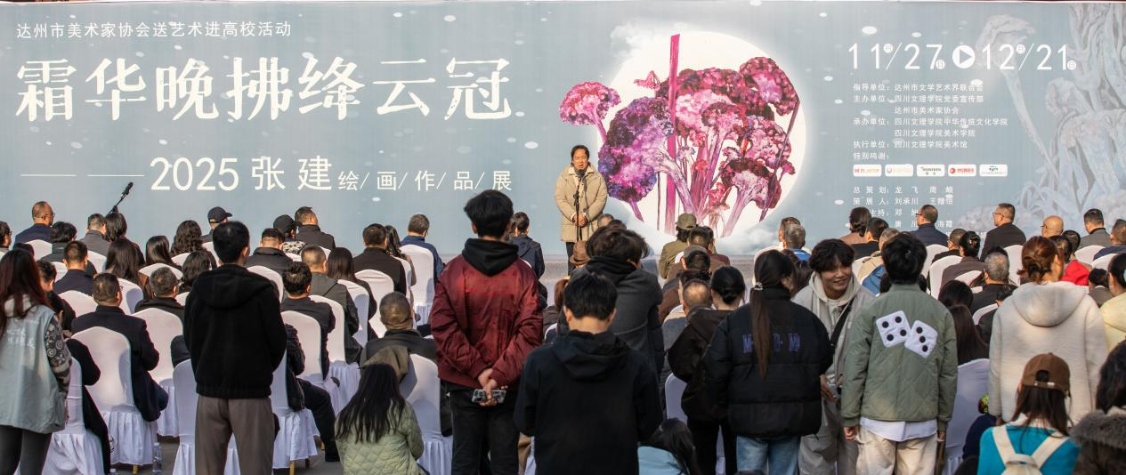 2025年11月27日,由达州市文学艺术界联合会指导,达州市美术家协会、四川文理学院党委宣传部联合主办,四川文理学院中华传统文化学院、美术学院承办的达州市美术家协会“送艺术进高校”系列活动“霜华晚拂绛云冠——张建绘画作品展”在四川文理学院盛大启幕。