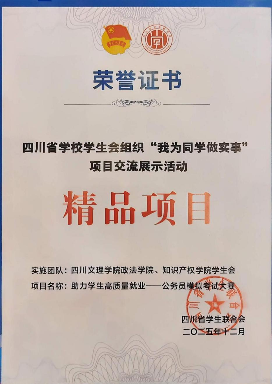 12月14日至15日,由共青团四川省委、四川省学生联合会主办的2025年四川省学校学生会组织“我为同学做实事”项目交流展示活动在成都举行。我校政法学院、知识产权学院学生会申报的“助力学生高质量就业——公务员模拟考试大赛”项目,成功入选2025年四川省学校学生会组织“我为同学做实事”精品项目。